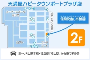 店舗は、「天満屋ハピータウンポートプラザ」の2Fにございます。食料品なども買えるショッピングセンターになりますので、お買い物の際にもお立ち寄りください。