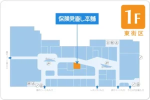 「保険見直し本舗 イオンタウン姶良店」は、イオンタウン姶良の東街区1Fで営業していますのでお気軽にご予約ください。