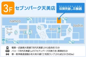 店舗は、阪神高速道路6号大和川線「三宅西」ランプから数分のところにある大型ショッピングモール「セブンパーク天美」の3Fにございます。